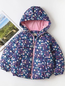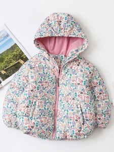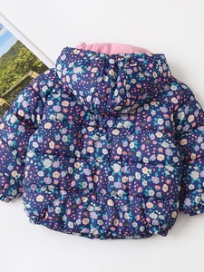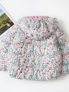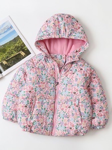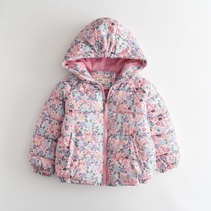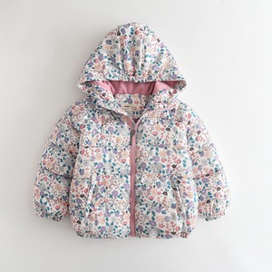 女の子の綿入りジャケット 2025 冬の新しいスタイルのフルプリントの花とベルベットの厚みのあるフード付き暖かい子供用綿入りジャケット
