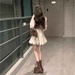 フレンチジェントルスタイルのウエストストラップドレス女子学生+ショートベスト2点セット