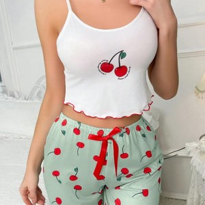 2025 夏クロスボーダーパジャマホームチェリーキャミソール女性はズボンを着用できるツーピースホームウェアセット