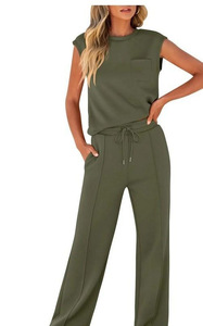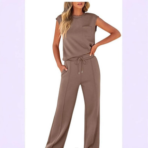 Amazonヨーロッパとアメリカのクロスボーダー新製品セット2025レディース無地カジュアルノースリーブトップとハイウエストパンツ2点セット