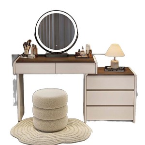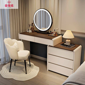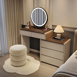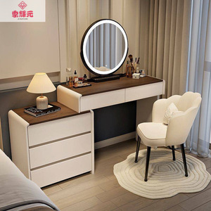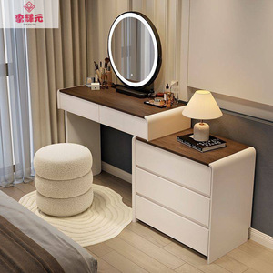 新しい寝室無垢材ドレッシングテーブルウォールナットカラーメイクアップテーブルとキャビネット一体型モダンライト高級メイクアップテーブルベースボード付き