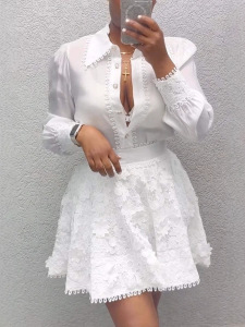 ヨーロッパとアメリカの国境を越えた新しいスタイルの中空レースシャツ襟ボタンシャツレースショートスカートスーツ白女性服