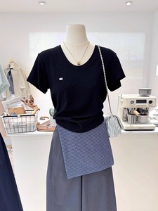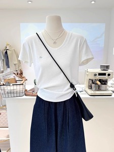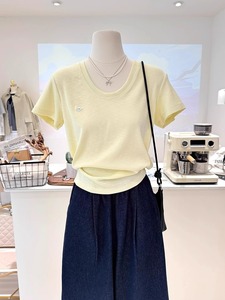 13ライン韓国ミルクイエローUネック右肩半袖Tシャツレディース夏シンプル万能無地Tシャツ超見栄えの良いトップス