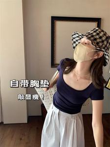 【胸パッド付き】痩身スクエアネックホワイトトップ2025ユニークで美しい純粋な欲望スタイルの伸縮性のある右肩Tシャツ