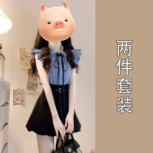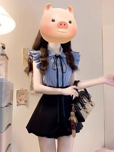 カレッジスタイルカジュアルファッションスーツ夏のハイエンド甘い小柄なブルーストライプシャツショーツ2点セット