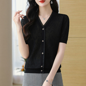 夏服 2025 新しいママスタイル半袖トップ薄いアイスシルクセーター V ネック半袖女性の Tシャツ