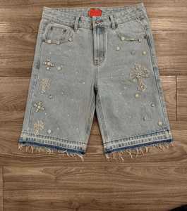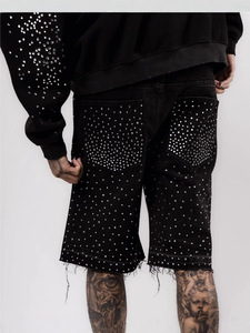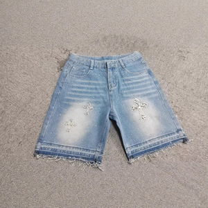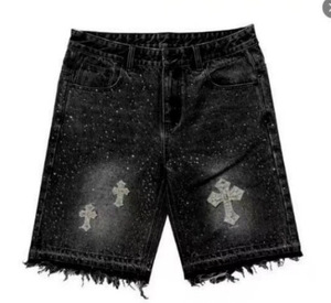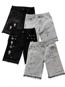 ヨーロッパとアメリカのクロスボーダーハイストリートフルダイヤモンド2025新しいヒップホップクロスストレートホットダイヤモンドデニムショートパンツ5点ジーンズ