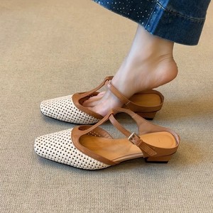 太ヒール3cm 新品フレンチカラーブロック通勤太ヒールTストラップ編み込み中空つま先サンダル女性用つま先ハーフスリッパ