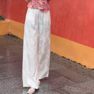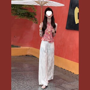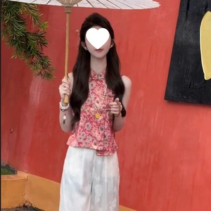 新しい中国風の国民風ファッションスーツ女性の夏スタイルバックルジャカードノースリーブベストトップワイドレッグパンツ 2 点セット
