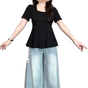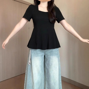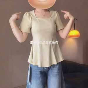 ファットMMプラスサイズ婦人服ペア型体型お腹カバーシックトップ2025新作ヨーロピアンスタイルスクエアネック半袖Tシャツ