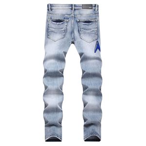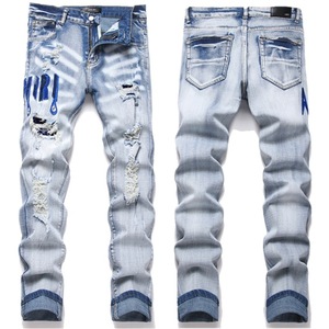 在庫ありエイミー ハイストリート ブルー スリム ストレッチ リップド パッチ刺繍 ユース メンズ ストリート トレンディ フット ジーンズ