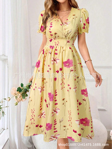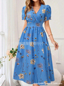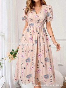 2025 夏ヨーロッパとアメリカの貿易クロスボーダー婦人服アマゾン人気のラウンドネック花びら袖半袖ミドル丈プリントドレス