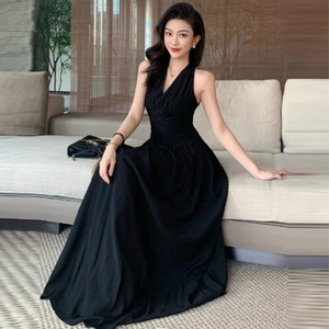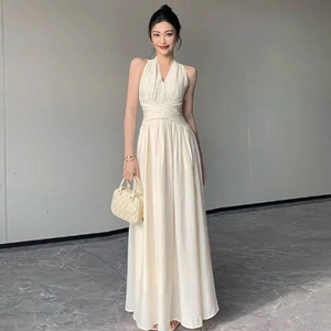 フレンチホワイトノースリーブホルターネックVネックドレス女性用2025新しい夏スタイル美しいウエスト痩身ロングスカート
