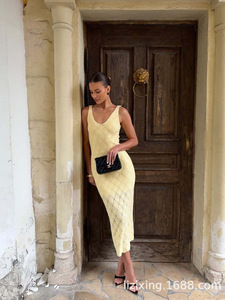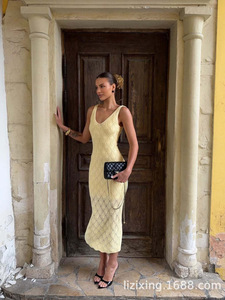 2025欧米風クロスボーダー爆種貝殻透かし彫りビーチスカートニット透かし彫り丸襟ノースリーブロングワンピース夏
