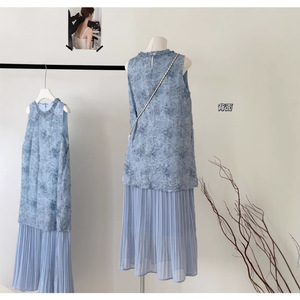 ブルーのフェイクツーピースドレス