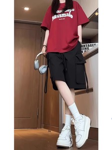 レトロな機能的な黒のカーゴショーツ、トレンディな夏の女性の薄いルーズで多用途なスポーツとレジャーの 5 分パンツ トレンド