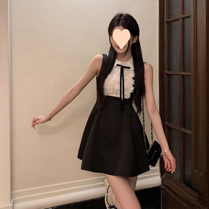 パッチワークレースドール夏気質スリムドレスフレンチノースリーブAラインスカートウエストショートスカート