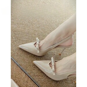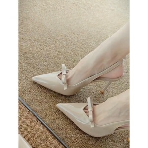 女性用の新しいスタイルのリボンハイヒール、ニッチな気質、春と秋のポインテッドトゥ、スティレットヒール、パテントレザー、ヌードカラー、バックオープントゥサンダル