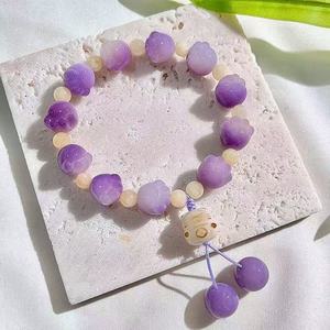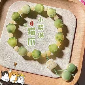 花の前にある小さなライムの招き猫ブレスレット、猫の足、手持ちの仏珠、見栄えの良いブレスレット