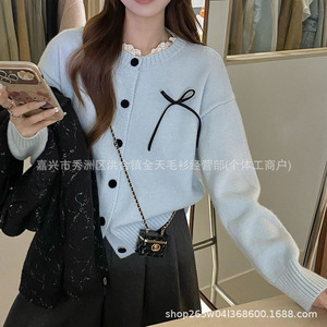 韓国の優しくて万能で甘くて爽やかな年齢軽減ネックラインレースニットカーディガンシングルブレストリボンセーター