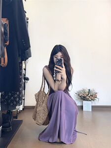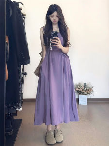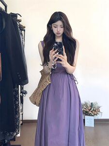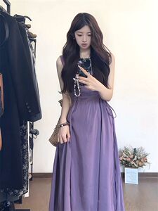 パープルサスペンダードレス女性の夏のシックなウエスト巾着ミディドレスドーパミン着用半袖 A ラインスカート