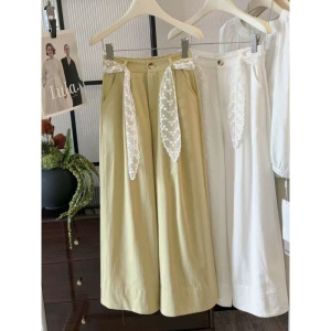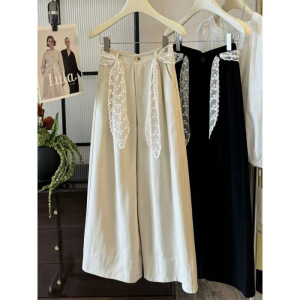 2025 新しい女性のためのワイドレッグパンツ、ハイウエスト、スリムストレートパンツ、レースベルト装飾、夏スタイル、ゆったりとした大きなレッグ