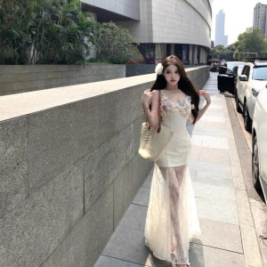 夏の美しい写真撮影ドレス、ヘビーレーススカート、フレンチエレガントなホリデーサスペンダーロングスカート