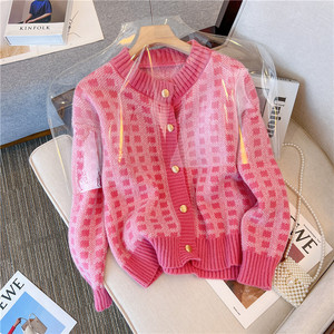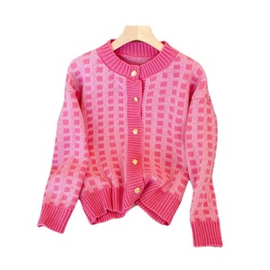 新しいスタイルのショートスタイルのセレブリティセーター、人気のジャケットトップ、女性用の小さな香りのピンクのチェック柄セーター