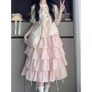 日本の甘いガーリーリボンストラップシャツ女子学生夏チェック柄ケーキスカートスーツ