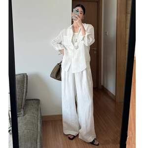 オールドマネースタイル 100 リネンスーツ女性のシャツ夏の新しいファッション日焼け止め白シャツハイエンドワイドレッグパンツ