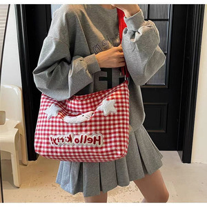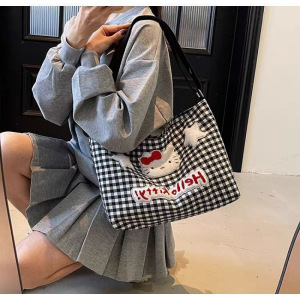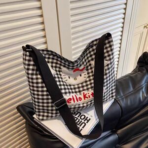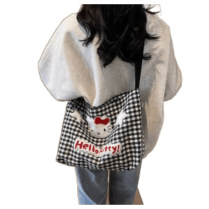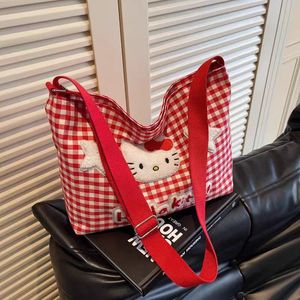 かわいいハローキティチェック柄ショルダーバッグ女性漫画大容量クロスボディキャンバスバッグ学生クラスの通勤バッグ