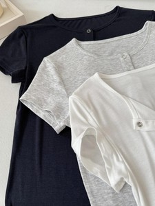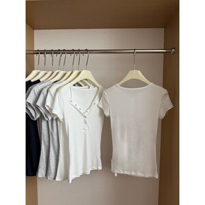 テンセル無地ヘンリーネックボタンデザインTシャツレディース夏ウエスト気質右肩半袖トップ