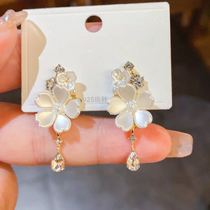 シルバー針の小さな新鮮なダイヤモンドがちりばめられた模造真珠の水滴フラワーイヤリング、個性、シンプル、ニッチな気質、女性用のハイエンドイヤリング
