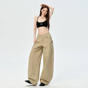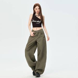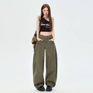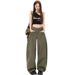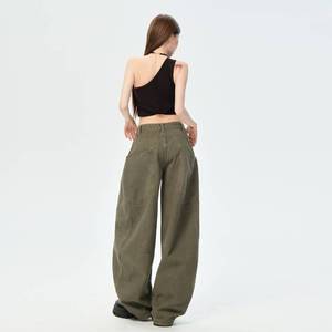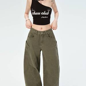 卸売アーミーグリーンアメリカンレトロデザインビッグポケットシミタージーンズ女性フロアレングスワイドレッグパンツ