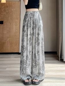 氷の糸の高腰の復古の怠惰なプリントの広腿のズボンの女性の夏のゆったりしているペンダント感は肉を遮って痩せているストレートのカジュアルなズボンを現します。