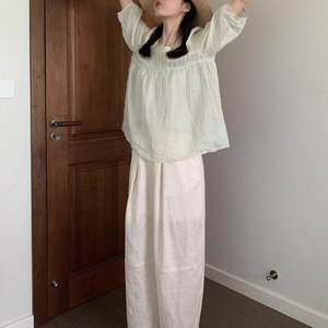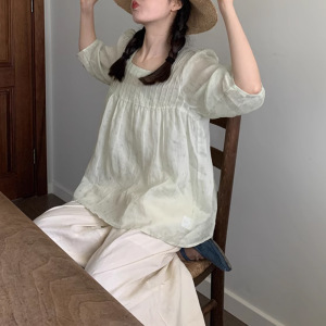 Mengxiang ▏ クリアで波状のラミーの軽くて薄いグレーとブルー/ライトグリーンのトップスクエアカラーシャツベビードールシャツ