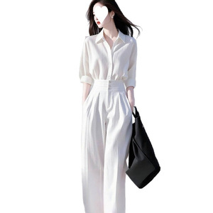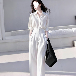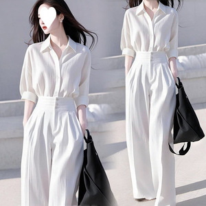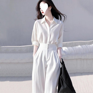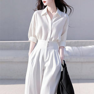 高级感老钱风穿搭女2025秋季新款简约气质中袖衬衫阔腿裤两件套装