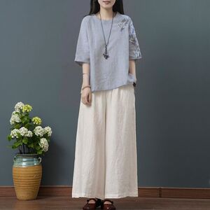 ゆったり大きいサイズの婦人服中年ママ夏リネン刺繍綿麻トップスレディース半袖シャツ9点パンツスーツ