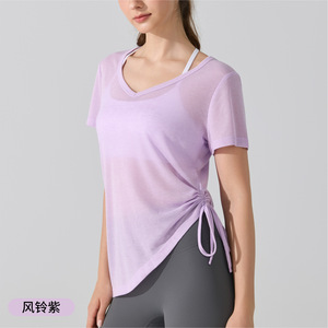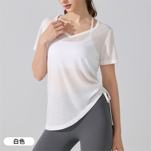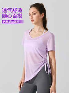 ゆったりとしたカジュアルなヨガウェアブラウス通気性のあるテンセル半袖トップスプリーツ巾着ピラティスダンスフィットネスTシャツ