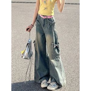 女性用のトレンディなマルチポケットボウタイワークジーンズ、新しいハイウエストルーズストレートレッグ多用途ワイドレッグフロアレングスパンツ
