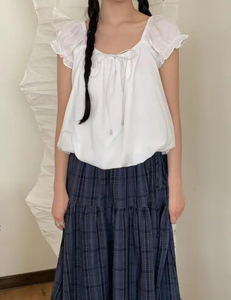返品交換不可 2025年新作夏スタイル 韓国東大門 スイートエイジリダクション スクエアネック レースアップ パフスリーブ 半袖シャツ