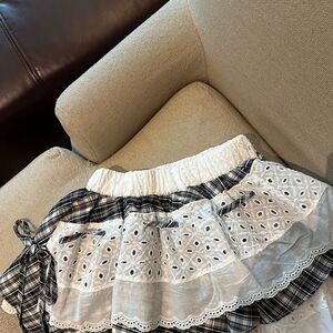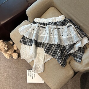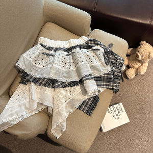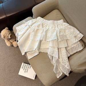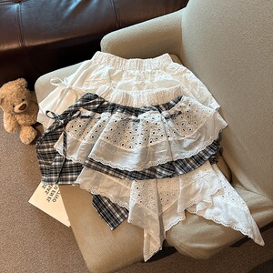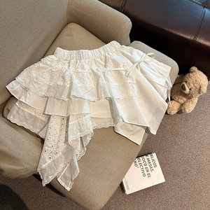 2025年春夏の新作の実物写真、露出を防ぐレーススカートを組み合わせたイレギュラーカッティングデザインのホットガールショートスカート