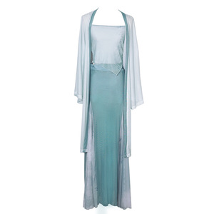 スカイブルーのアウターシャツ+サスペンダー+ワンピースロングスカート
