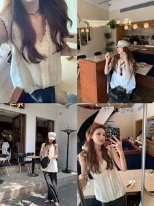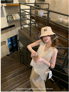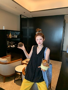 aaaaxbbb 波本威士忌 天丝亚麻花边背心木耳边无袖上衣宽松V领t恤