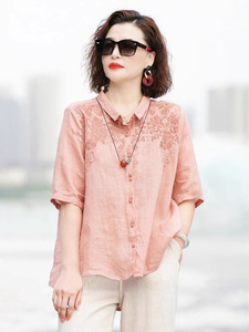 2025 新しい夏のスタイルの女性用ラミー刺繍シャツトップス、ゆったりとした七分袖シャツジャケット、多用途の薄いシャツ