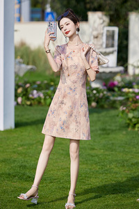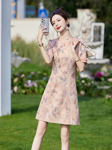 新しい中国風の改良されたチャイナドレス、ファッショナブルでエレガント、新鮮なシルクAラインスカート、中国風のラウンドネックプリントドレス