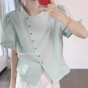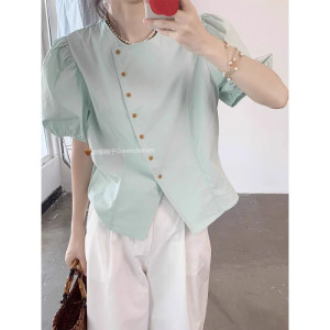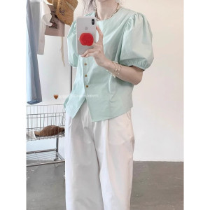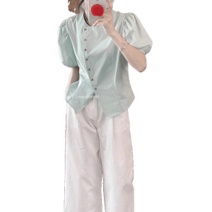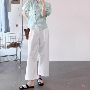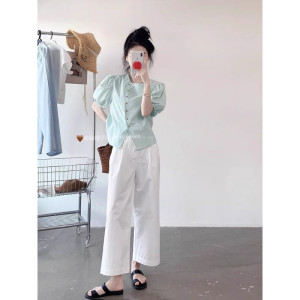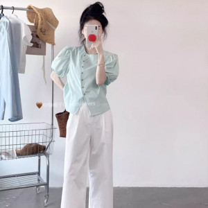 V5H フレンチ不規則バブル半袖シャツ白ワイドレッグパンツ女性の夏大きいサイズファットmmハイエンド痩身