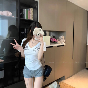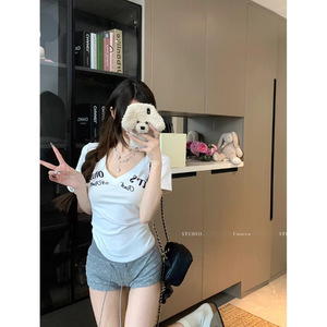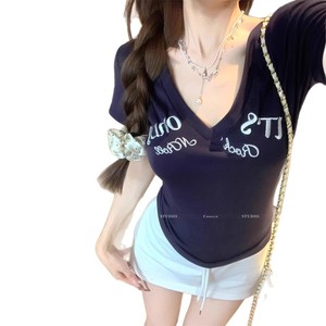 アメリカンレトロVネックショルダーTシャツレディース2025夏新作スリムフィットレター刺繍ショートトップトレンディ