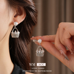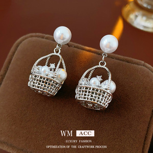 シルバー針ジルコン編み込みフラワーバスケットパールイヤリング女性用、軽い高級感、ハイエンドの絶妙なイヤリング、フレンチレトロな多用途イヤリング