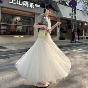 2025 新しい夏のガーゼスカート白メッシュスカート女性のドレープ A ラインハイウエストロングスカート大きな裾チュチュスカート